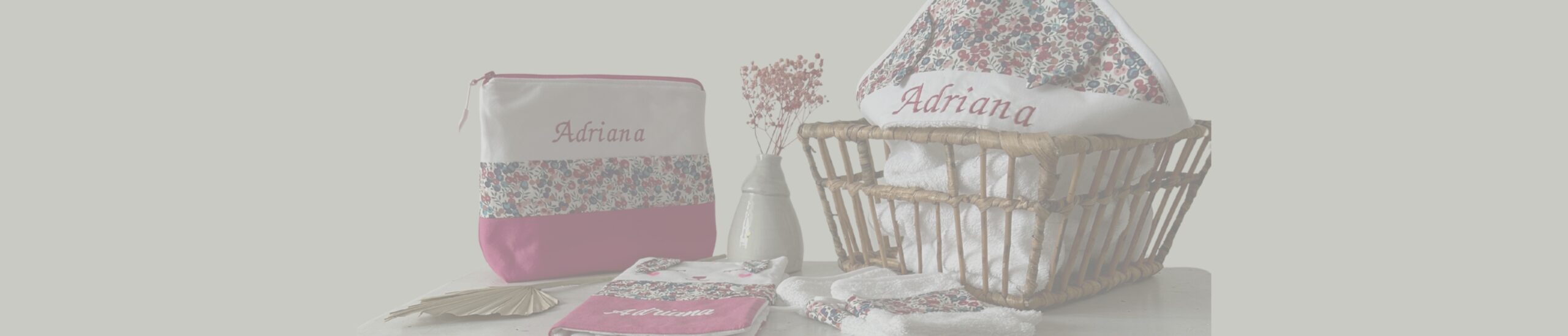Trousses de toilette au prénom de bébé, cape de bain personnalisée, protège carnet de santé fait main, couverture, peignoirs et serviettes de toilette brodées, sacs week-end et autres accessoires Liberty personnalisés.