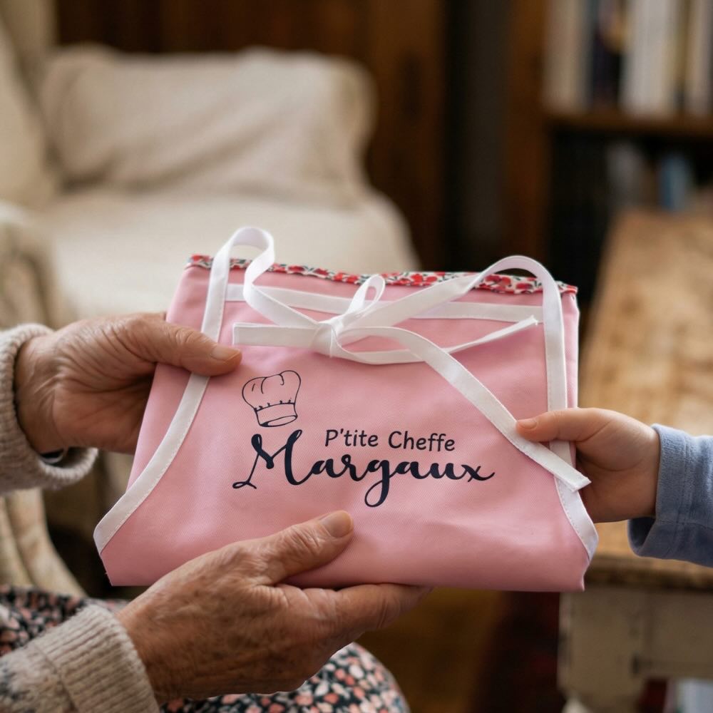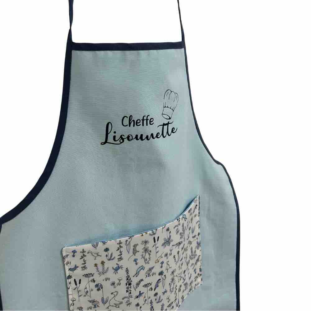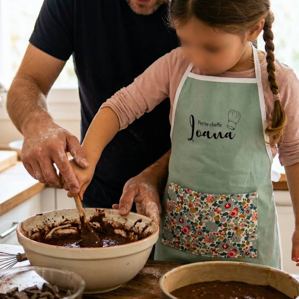 Votre enfant a du potentiel pour devenir un véritable cordon bleu, il aime mettre les petits plats dans les grands, mais il s’en met partout ? Profitez d’un vrai moment de complicité en lui créant un adorable tablier de cuisine pour le protéger des tâches et cuisiner sereinement ! Le plus : vous pouvez choisir un tablier personnalisé !
