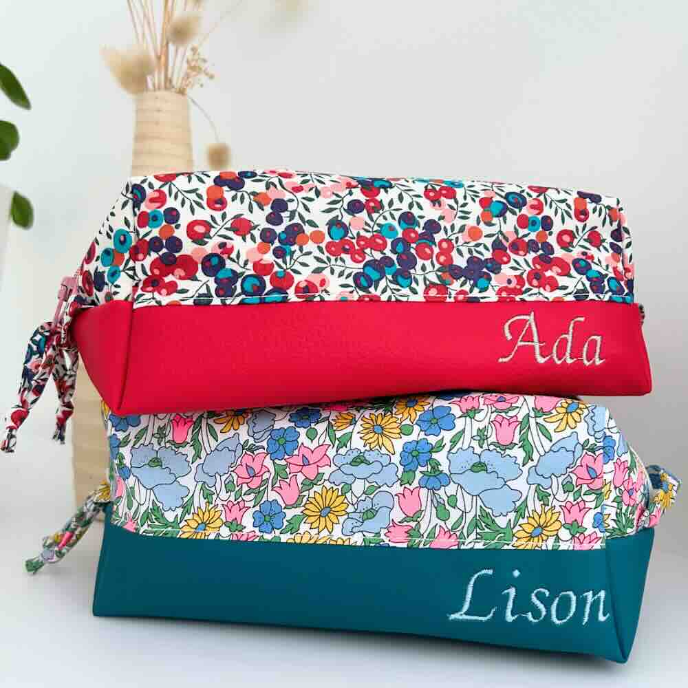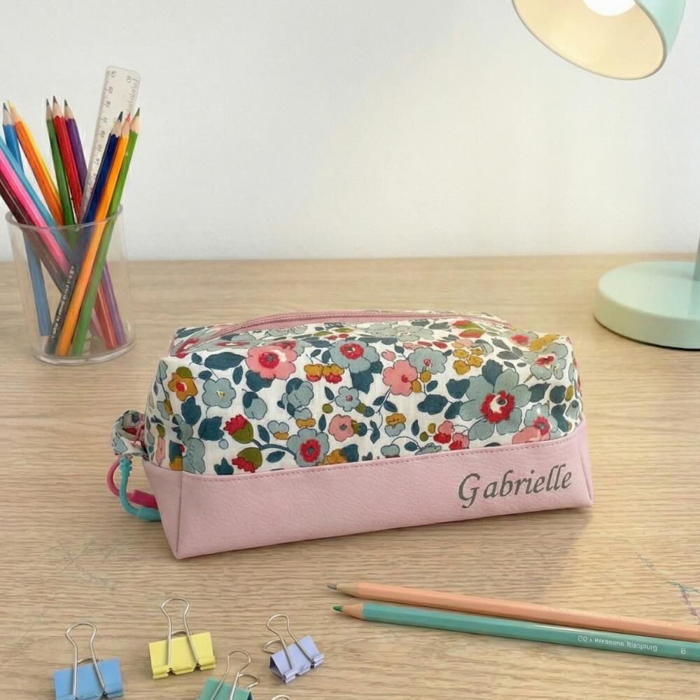 Notre trousse double compartiment conçue en simili cuir et en tissu liberty pour l’extérieur et un coton uni pour l’intérieure. Notre choix se porte naturellement sur le simili cuir pour son côté robuste. Pour la touche ludique un motif fleuri avec notre sélection de tissu Liberty of London.