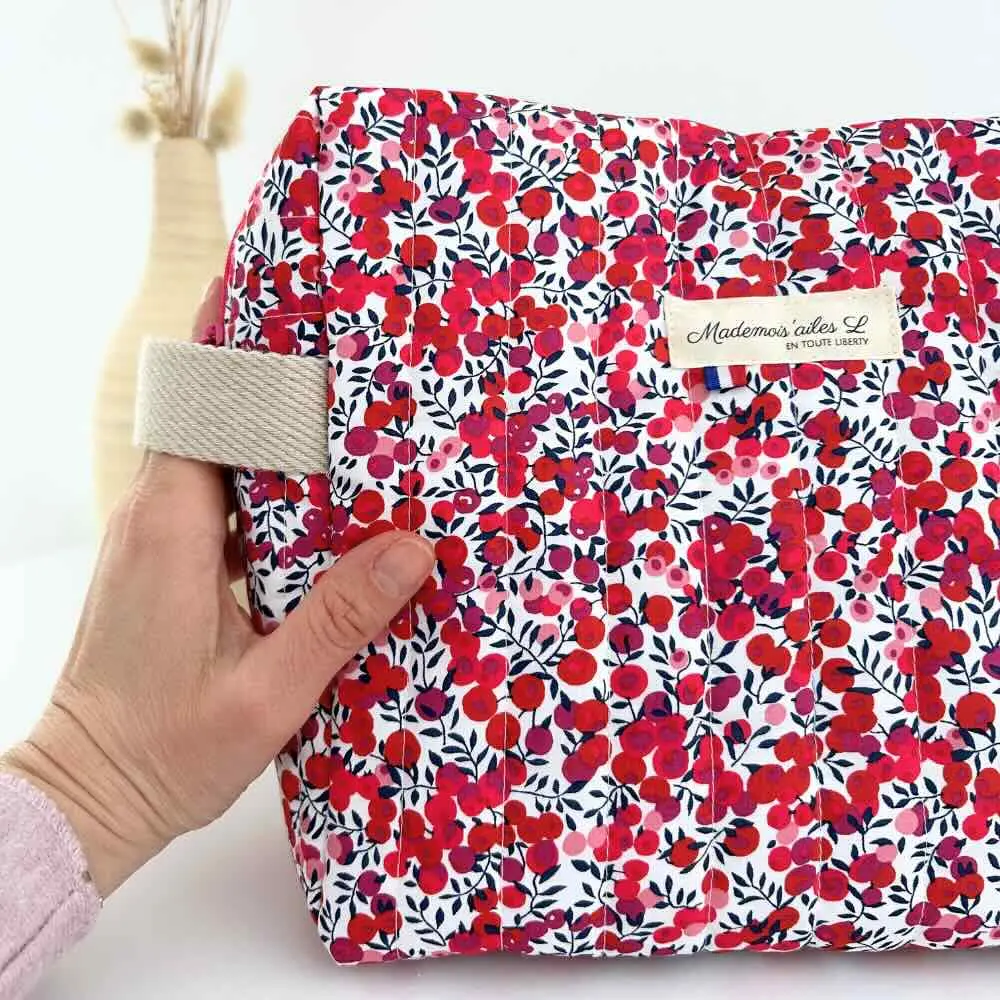 Cette trousse de toilette se compose essentiellement de deux matières sélectionnées pour leur qualité. L’extérieur est fait en coton soyeux, fibre résistante et douce. Pour une belle qualité, un autre tissu coton double le tissu Liberty avant le matelassage, pour un joli rendu et une bonne tenue. L’intérieur est également en coton, ce qui facilite l’entretien.