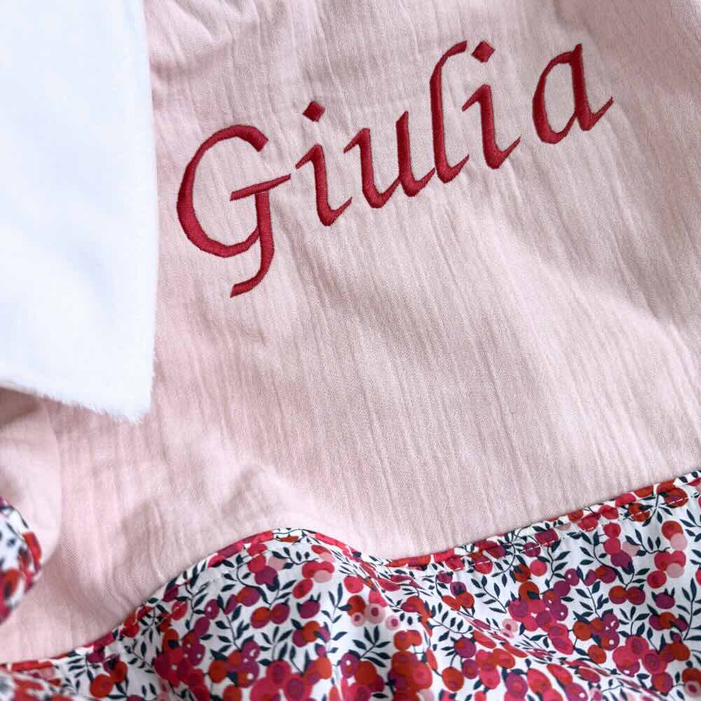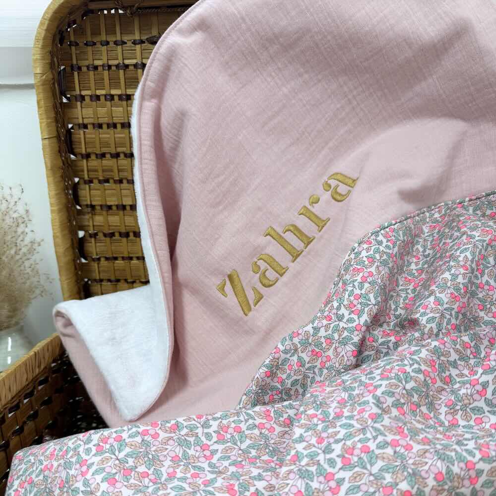 Ce qui rend la couverture bébé liberty personnalisée encore plus spéciale, c’est la possibilité de la personnaliser avec une jolie broderie. Vous pouvez choisir le nom du bébé, ou de jolies initiales fleuries pour rendre ce cadeau vraiment unique.